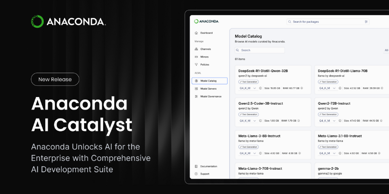 Anaconda Inc. has introduced AI Catalyst, an enterprise-grade AI development suite built into the Anaconda Platform and powered by AWS, offering a complete ecosystem for creating, deploying, and managing AI applications. Now available to AWS customers, the suite provides transparent, governed, and scalable AI development. AI Catalyst debuts with a curated catalog of secure, vetted models, allowing organizations to discover, evaluate, compare, and run models within their own environment—helping minimize risk while strengthening governance and cost efficiency.