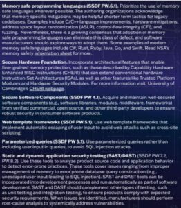 The CISA Secure by Design guidelines prescribe specific tactics during the software build and product development processes. These include memory-safe programming languages; hardware features; well maintained software libraries; parameterized queries; and static and dynamic application security testing. CISA also recommends vulnerability disclosure programs; cybersecurity performance goals, common vulnerability (CVE) completeness, and the creation of Software Bills of Materials. Figure 1.