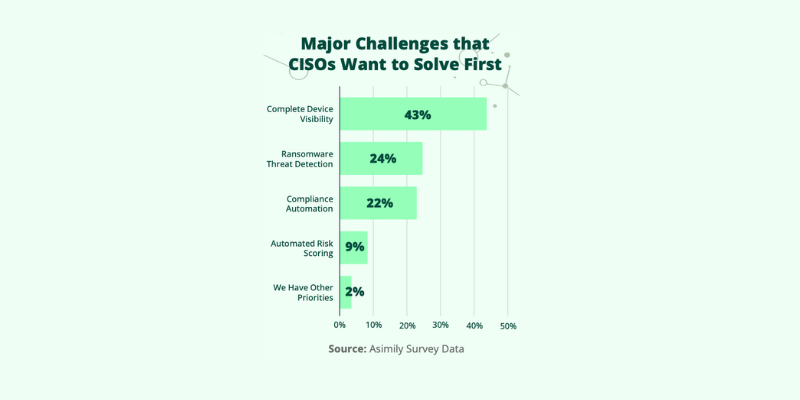 The survey of North American hospital CISOs found that 43% identified complete device visibility as the challenge they would most want to solve immediately, followed by ransomware threat detection (24%) and compliance automation (22%). When asked about their biggest barriers to effective IoMT device risk management, one-third pointed to internal process issues, closely followed by lack of visibility (30%) and data overload (20%).