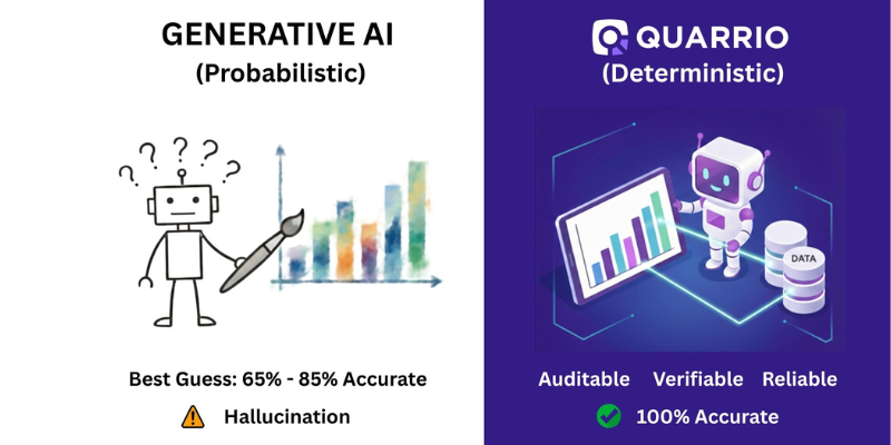 Unlike probability-driven GenAI, Quarrio’s architecture translates natural language into verified database queries against structured enterprise systems such as CRM, ERP, financial systems, and risk databases. Deterministic AI provides full query transparency and consistency: